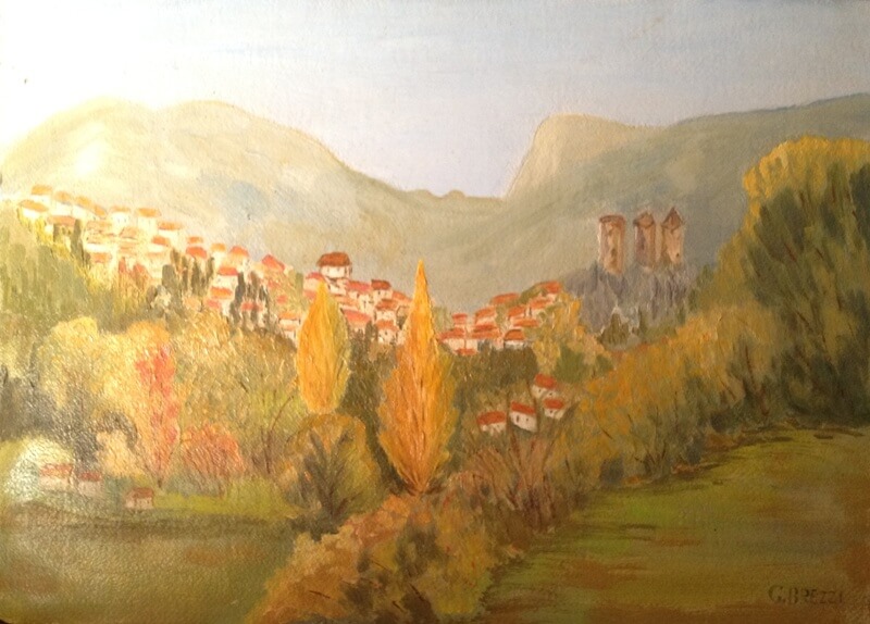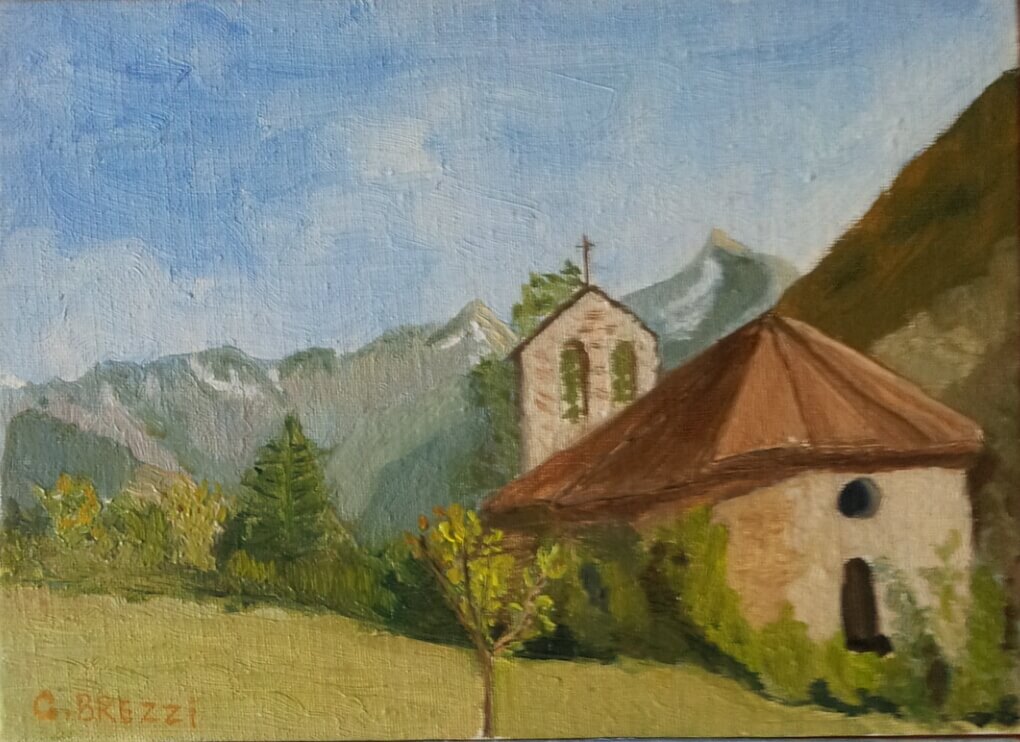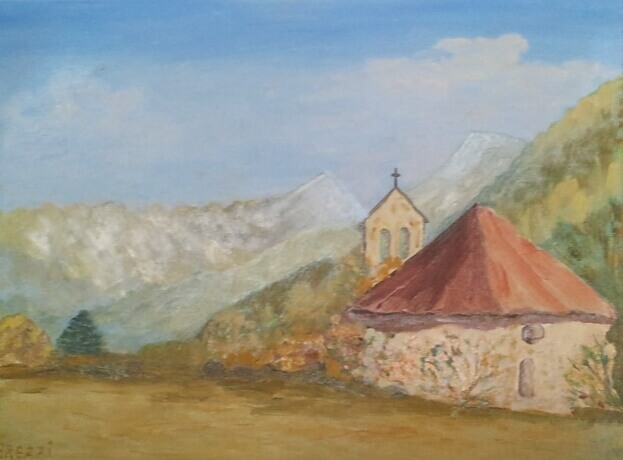 L'�glise de Aulus-les-Bains, Ari�ge - No�l 1984 - huile sur carton